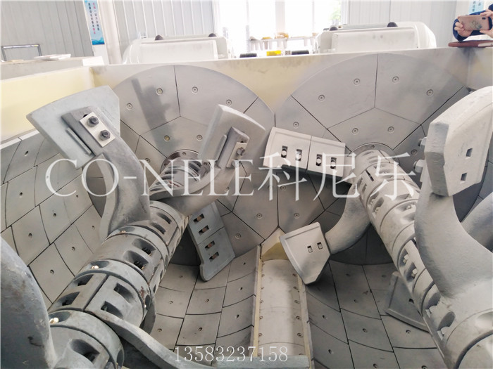 雙臥軸強制式混攪拌機的攪拌原理決定了在攪拌過程中混凝土大部分被堆積在兩個攪拌軸之間,使得攪拌臂和葉片與底部襯板之間的磨損降低,只有輕微磨損,甚至無磨損,使用壽命長。